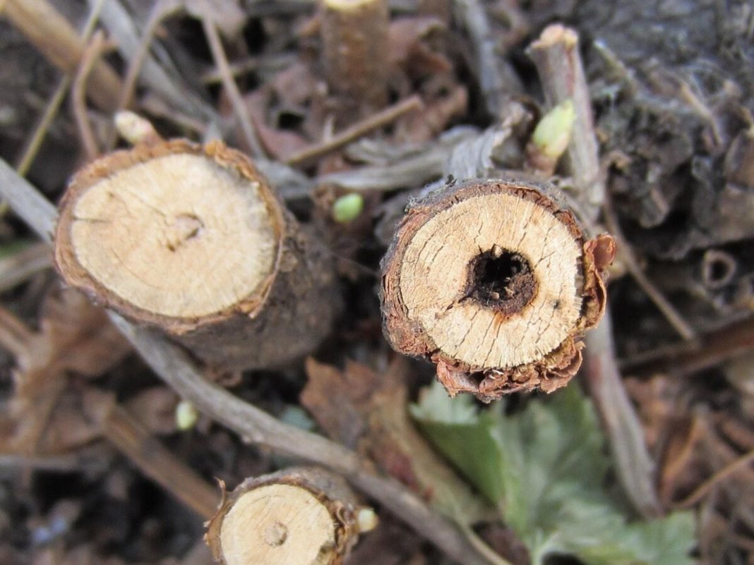 Taip pat apžiūriu žievę. Jei prie šakų pagrindo matau mažas skylutes arba ūgliai atrodo nusilpę, gali būti, kad viduje „padirbėjo“ stiklasparnis. Šis kenkėjas išgraužia šerdį, ir šaka pamažu džiūsta. Patikrinti paprasta – padarai pjūvį, ir jei viduje vietoj vientisos medienos matai tuščią juodą ertmę, vadinasi, jis. Šį kenkėją labai sunku išnaikinti, nes lerva gyvena šakos viduje ir yra apsaugota nuo purškimų. Vienintelis būdas – išpjauti pažeistas šakas visiškai.